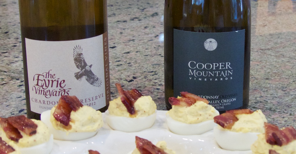 To my palate the Cooper Mountain Vineyards Chardonnay Old Vines is a lovely food wine. Interesting spice flavors combine with Chardonnay fruit flavors make this wine a good partner for food with lots of flavor. The bold flavors of our deviled eggs dominated by horseradish and candied bacon were not too big for this wine.