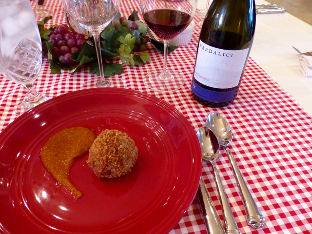 A few nights later we prepared the remainder of the arancini and served them with a green salad and another Sicilian red wine. The combination worked just fine as a main course too.