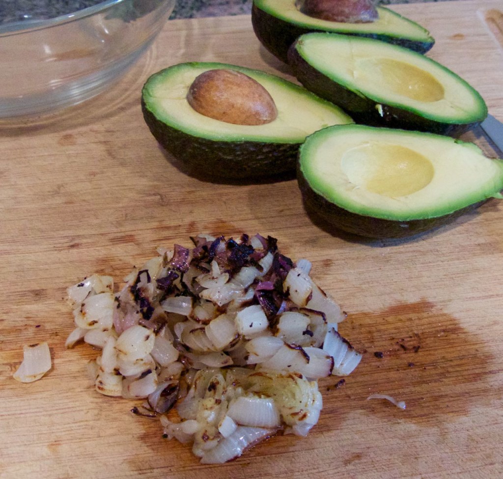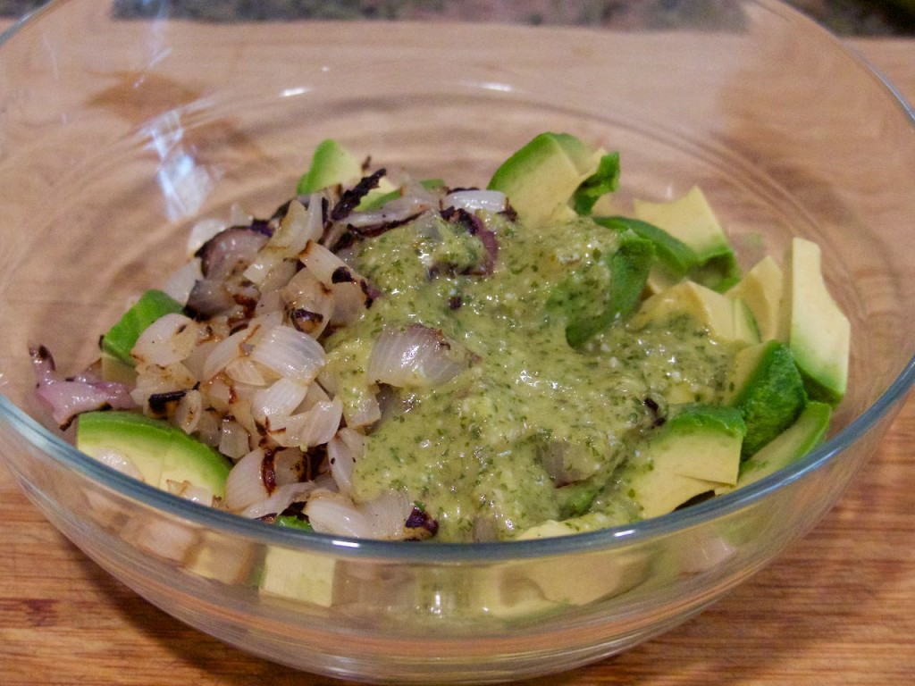 Once the onions were grilled, I chopped them and added them to the diced avocados along with a few teaspoons of the spicy dressing. This makes the rustic guacamole, which you can leave chunky or smash if you like the texture a bit more creamy.