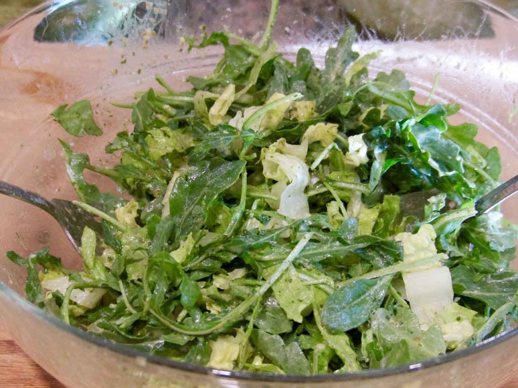 While Pete grilled the onions and the chicken breasts, I prepared the lettuce. In addition to the chopped romaine, I used a bit of baby arugula — just for interest.
